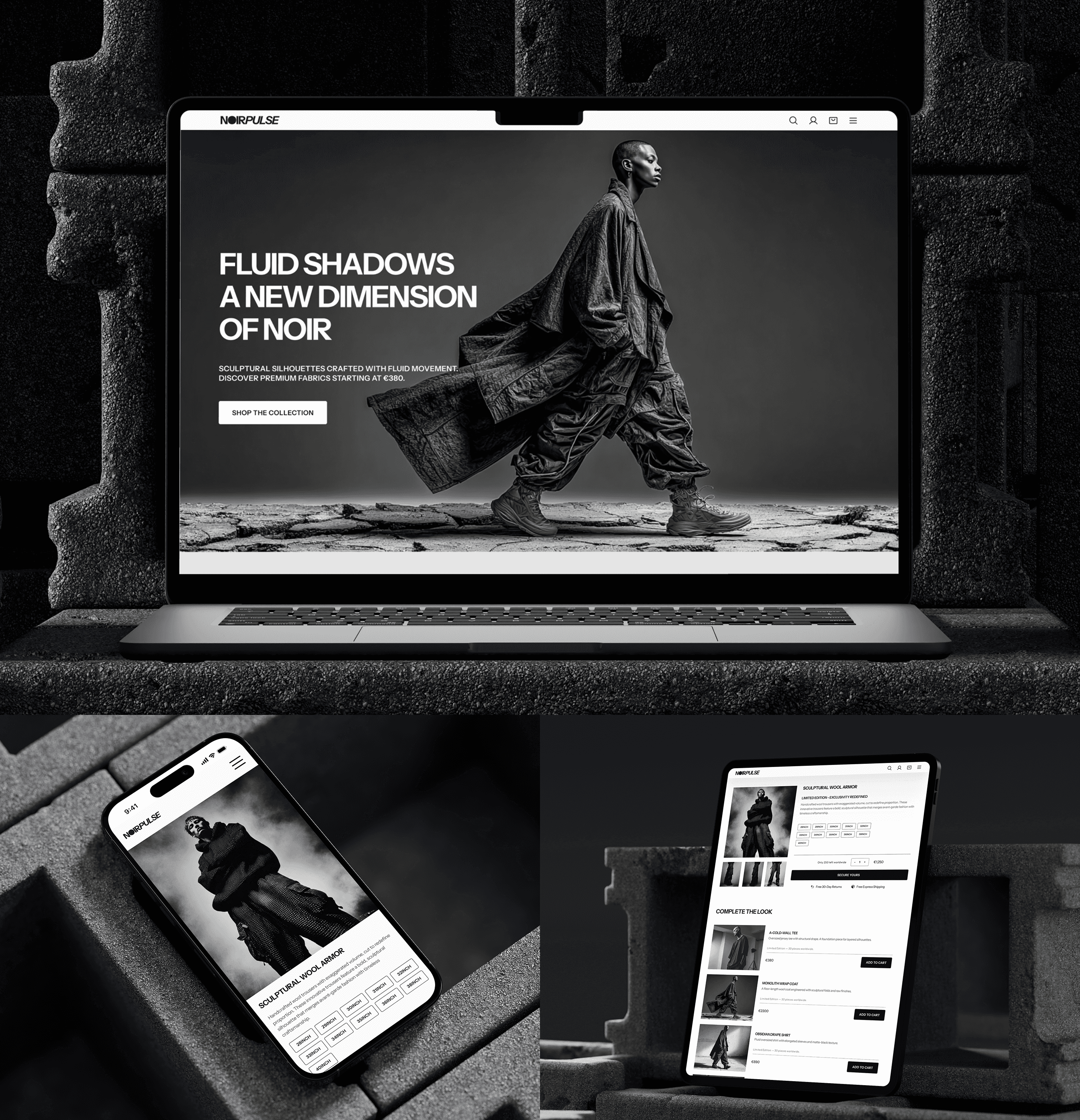 NoirPulse is a digital fashion concept designed to merge avant-garde aesthetics with seamless e-commerce usability. Inspired by the world of high-fashion editorials, the platform elevates products into cultural artifacts rather than simple commodities. Every touchpoint - from homepage to checkout - was crafted to feel exclusive, immersive, and refined, while remaining intuitive across desktop, tablet, and mobile.